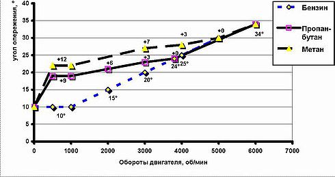 Однако оказалось, что для газа температура горения также выше и на богатых смесях. К сожалению, основная часть газового оборудования, устанавливаемого на автомобили в России - это оборудование карбюраторного типа. Кроме снижения мощности, увеличения расхода топлива, воспламенения топливовоздушной смеси во впускном коллекторе, неизбежны режимы резкого обеднения или обогащения горения смеси с изменением температурного режима. В связи с тем, что скорость горения газового топлива значительно медленнее бензина, то следует предусматривать изменение угла опережения зажигания (рис.2). Такое изменение предусмотрено не во всех газовых системах питания. Поэтому, в лучшем случае, на практике установщики просто сдвигают распределитель зажигания на глазок. В современных двигателях это можно сделать с помощью специальных устройств – процессоров опережения зажигания.