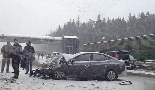 "13 марта оказалось роковым днем для автомобилистов, которые поехали по Минскому шоссе. Снег и скользкая дорога привели к тому, что в районе Жаворонок Одинцовского района столкнулись полтора десятка машин.