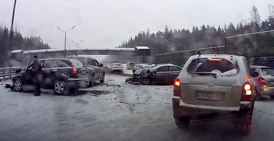 «Первая случилась в районе 8:30 утра с участием трех машин. После чего, поскольку дорога была скользкая, а движение потока очень интенсивное, люди стали пытаться останавливаться, но не всем это удавалось. Случилась еще одна авария с участием еще трех машин, а следом третья авария уже из восьми машин. В итоге столкнулись 14 автомобилей в трех авариях в течение 15-20 минут. К счастью, жертвами этих аварий оказались только автомобили, люди не пострадали».