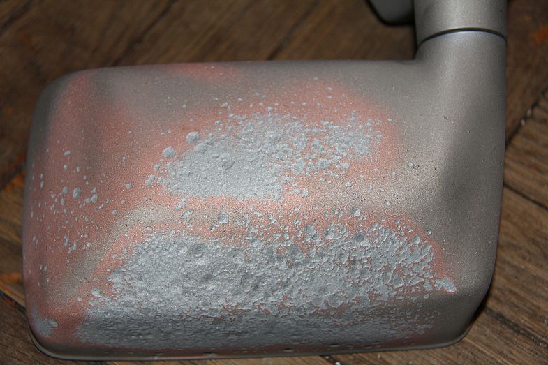 на этой фотографии отпескоструенный хром. на корпусе зеркала виден скоол. там была ракушка, то есть вздулся хром и силумин.