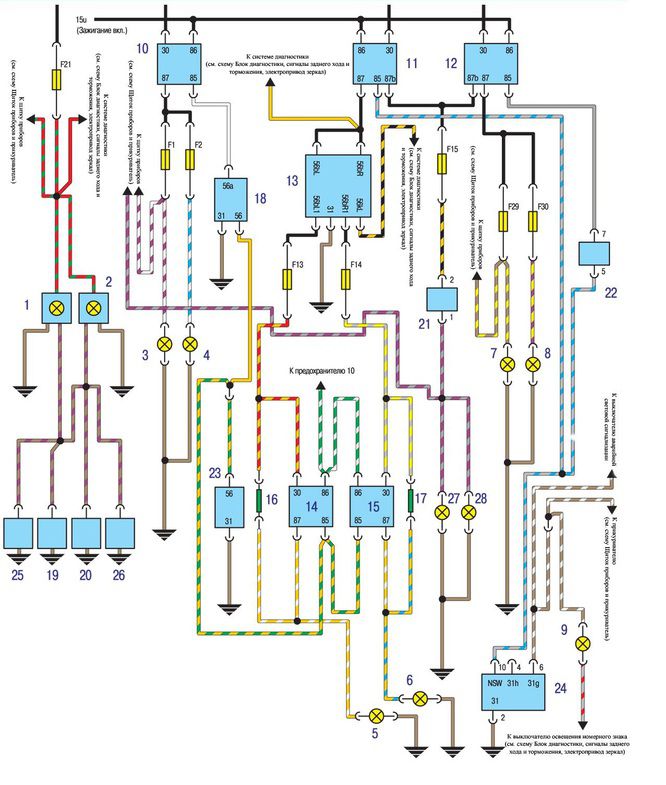 выключатель передних противотуманных фар 25. Концевой выключатель левой задней двери 26. Концевой выключатель правой задней двери 27. Лампа противотуманного света левого заднего фонаря 28. Лампа противотуманного света правого