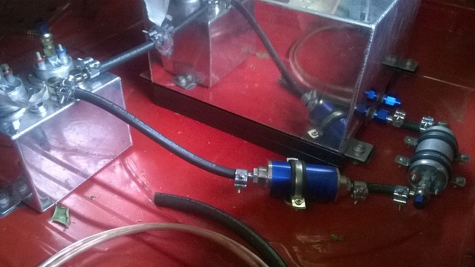 Так все выглядит финишно (за исключением вентеляции, с ней вопрос не решен), два подающих (основных) насоса Bosch 044 (оригинал, не то место где можно экономить) установленных непосредственно в противоотливный бак, фильтр, перекачивающий насос (аналог боша, но не Китай) ну и сам бак, схема циркуляции топлива думаю понятна (забегая вперед хочу сказать что все работает хорошо)