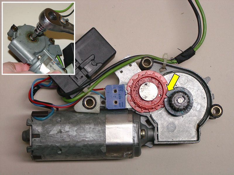 6. Теперь ищем нулевое положение мотора. Черное отверстие на пластмассовом колесе должно смотреть на вал основной стальной шестерни. При этом прорезь на маленькой пластиковой шестерне должно смотреть тоже на отверстие. Тут мотор от е36, но суть такая же: