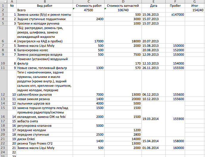 Практически все действия (по крайней мере ключевые) я записывал в Excel файл, скрин из которого приложен. Политика покупки запчастей была "если подшипники, то SKF, если железки, то lemforder" и тд.