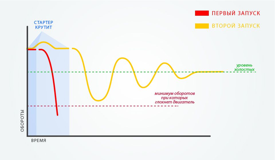 НО, когда двигатель заводиться, ощущение что первые несколько секунд обороты плавают. Прилагаю график, для наглядности (не очень точный). Надеюсь будет понятно.