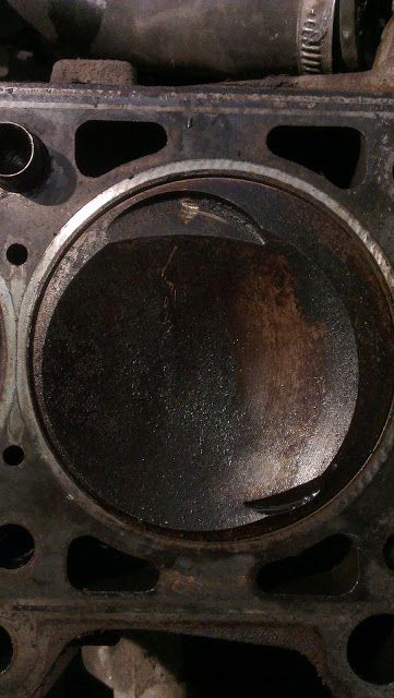 Тем временем голова была демонтирована и передана в ремонт. Предположения подтвердились: загнут клапан на 1 цилиндре и под подозрением на 6. На поршне первого цилиндра небольшая коцка от встречи с клапаном. Насколько я могу догадываться, погнуло при прокручивании коленвала отдельно от распредвала, т.к., судя по всему, удар был один. Клапан погнут незначительно - не закрывается на 0,5 мм по одной стороне. Так что есть все надежды на быстрый и не дорогой ремонт.