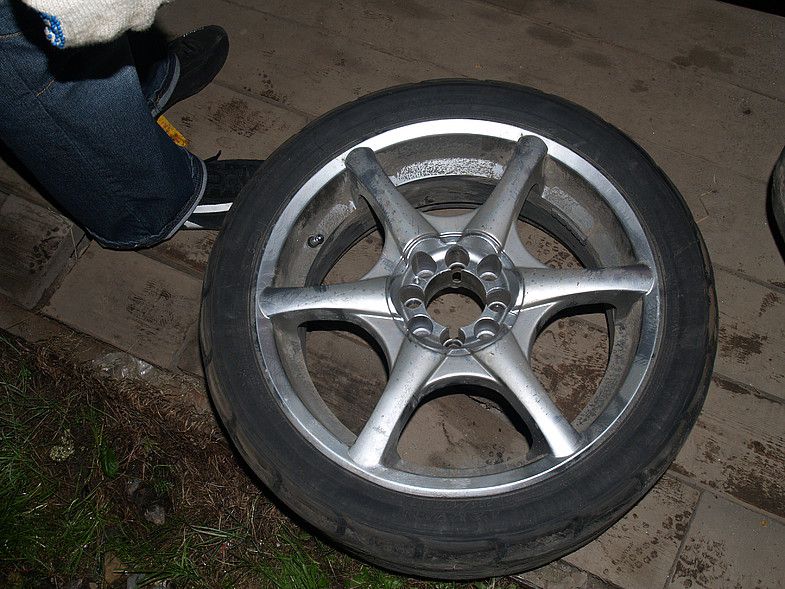 резины не было 17-й... пришлось ставить сзади 15-е бублики... НО! после первого заезда они сдулись! и чисто по орковски, я поставил на зад два зимних колеса... и поехал на них! устроил маленький дрифт заезд... по мокрому асфальту...