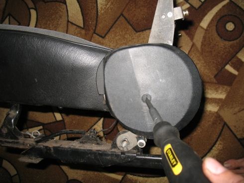 - Выкручиваем снизу спинки 2 самореза, удерживающих крышку спинки, и снимаем ее, сдвигая вниз.