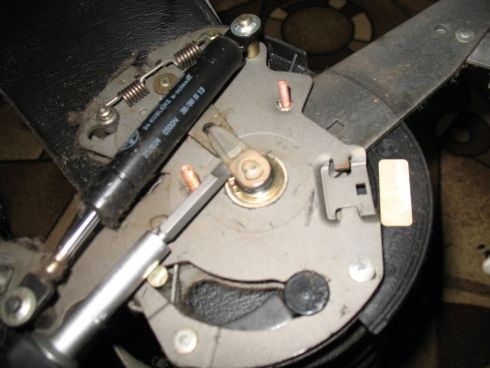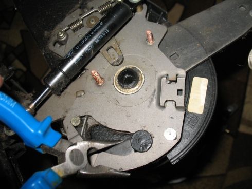 4 Снимаем стопорное кольцо, затем плоскогубцами прижимаем серый рычаг и проворачиваем механизм
