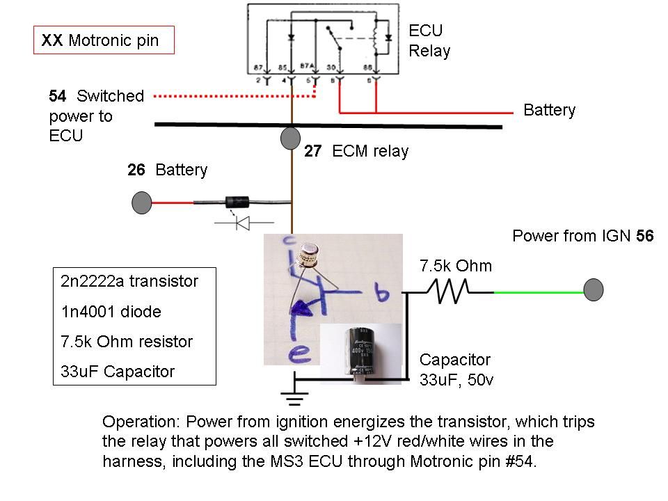 с diyefi.co.uk не парился с транзистором, кондюком и резистором, а просто через диод подрубился к выходу включения насоса, т.е. главное реле у него не рулит мозгом, питает только периферию - форсы, рхх и т.п. а мозг питается всё же от зажигания. поидее и так норм - сквирт сам по себе жрет мало, токов сильных не будет ходить, так что перепаять с 37 на 27 не такой уж и плохой совет) как минимум завестись так можно. а может и на постоянку оставить ;)