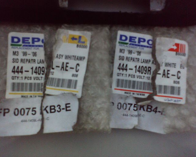 Недолго думая, были куплены новые «дымчатые» повторители DEPO для Е38 за 75грн. (9$) и на разборке за пиво взяты к ним разъемы кузовной проводки. На фото видно их номера, если кому-то будет нужно. Кстати удивила маркировка, указывающая, что они для М3 1999-2006 года…