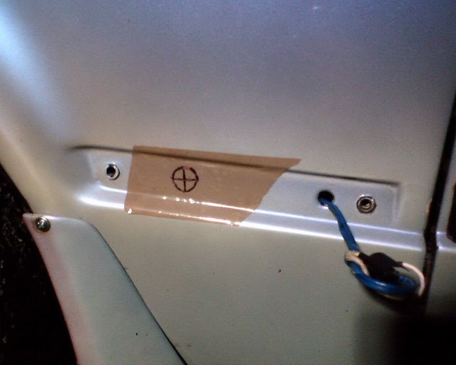 Далее клеим на крыло скотч и размечаем место отверстия диаметром 16мм для свободного прохода разъема проводки.