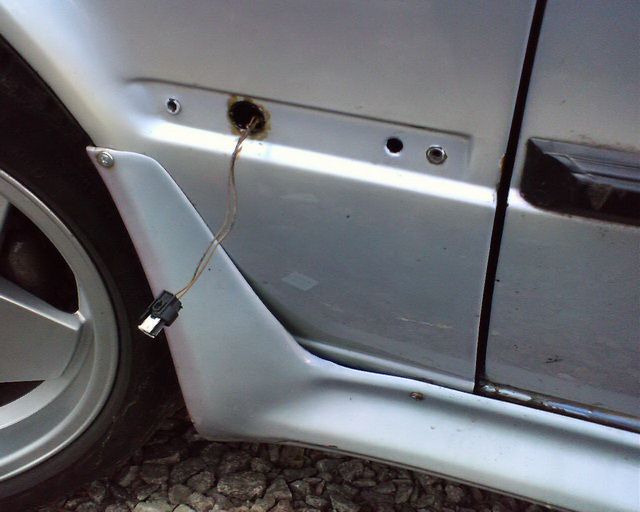 Края отверстия для предотвращения коррозии грунтуем, красим и обрабатываем мовилем. Проводку прокладываем от переднего поворота по нише крыла, над стоковым пластиковым подкрылком. Подключаем разъем и саму проводку к проводке переднего поворота, соединения изолируем.