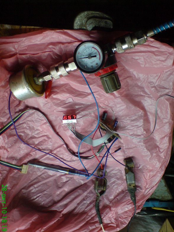 для етава накручиваем на дачек переходник 1/4 на быстраросъем, втыкаем его в редуктор, редуктар втыкаем в подачу сжатава свежева восдуха, потключаем провода к дачеку, переключаем електрасхему в режим индикации значения ацп (оно там 10бит), и вуаля!