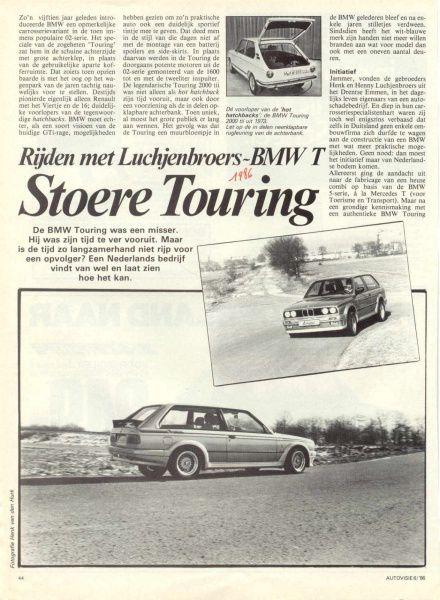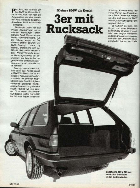 Певрый BMW-универсал был создан ещё в 1971 году и назывался BMW 1802 Touring e6. К сожалению, ни расширение гаммы до заряженного140-сильного 2002 tii Touring, ни обилие рекламы и даже складывающиеся задние сиденья, которые образовывали ровный пол, не дали должного эффекта и автомобиль не был воспринят публикой вообще никак. Эберхард фон Кюнхайм решил, что время универсалов ещё не пришло...