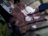 9. Дыра в пороге. Внутренние пороги вообще в ужасном состоянии. Внешние купить без проблем (за переварку берут 3000/оба - это много или нормально?), но проблема приварить в стыке - внутренние сгнили практически полностью. Внутренние пороги продаются? Или их срезают и латают заплатами?