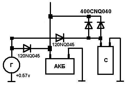 Диоды с барьером Шоттки это перебор смысл в том чтоб 2й акку м зарядку брал с гены а отдавал на усилок