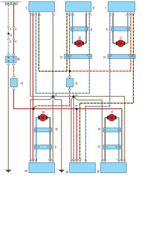 стеклоподъемника детьми 16. Электродвигатель стеклоподъемника передней левой двери 17. Электродвигатель стеклоподъемника передней правой двери 18. Разъем электродвигателя стеклоподъемника передней левой двери